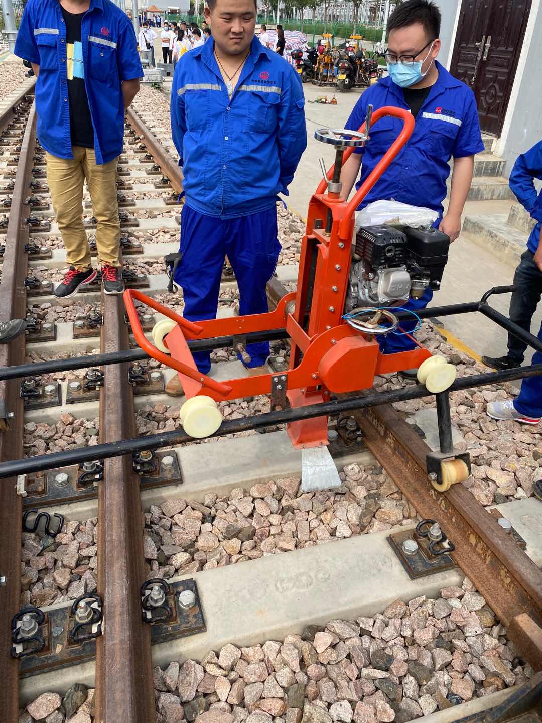 2、作(zuo)業前(qian),先將進給手(shou)輪旋轉到上邊,使砂輪遠離鋼(gang)軌面(mian),然后將輔助支承架支承好,啟動汽油機(ji)4,空轉30秒鐘,檢查傳動部分是(shi)否(fou)靈活、有無異常雜音,螺紋連接是(shi)否(fou)松動。