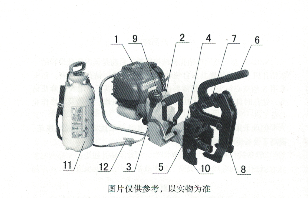 1. 汽油機、2.齒(chi)輪(lun)箱(xiang)、3.進水(shui)嘴、4標尺(chi)定(ding)位器、5.定(ding)位尺(chi)、6.夾緊搖臂(bei)、7.調整螺母、8.夾具體、9.進給扳把(ba)、10.定(ding)位塊、11.注(zhu)水(shui)桶、12.水(shui)閥