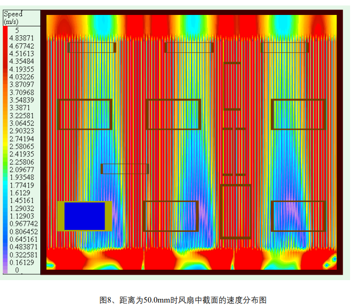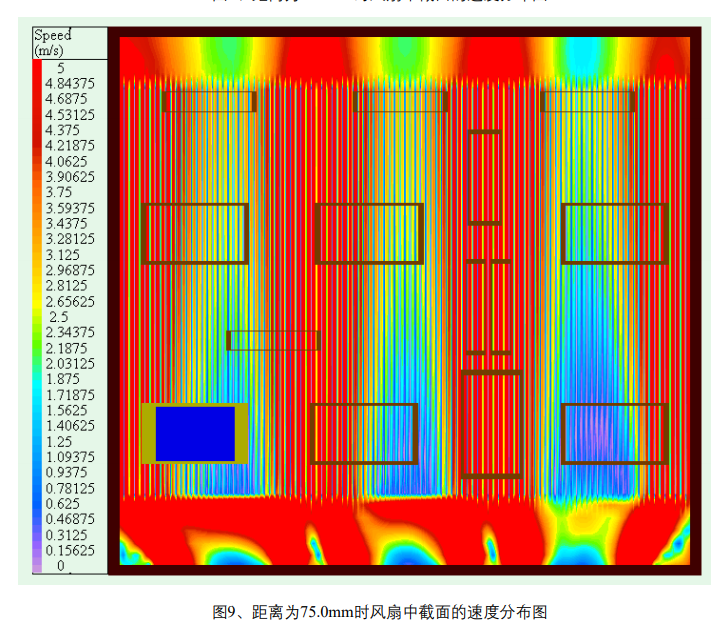 如圖7、8、9、10、11、12、13,它們分別是在不同距離的前提下,風扇的中截面速度分布圖。 由于在建模過程中,考慮到這是風扇吹風冷卻,風扇swirl對流場的影響較大,因此在模型中打開風 扇的swirl參數(shù)設置。 從下列的速度分布圖中可以看出:在吹風條件下,風扇swirl對流場的影響是非常顯著的,并且 其流場的均勻程度隨風扇距散熱器間的距離有較為顯著的變化。相比較而言,在風扇距散熱器間的 距離為25.0~75.0mm間,流場均勻程度與該距離的相關度較該距離為75.0~175.0mm時大。隨著距離 進一步的增大,散熱器齒間和散熱器入口的流場都變得更加的均勻,散熱器的效率得到進一步的提 高。當該距離達到或超過冷卻風扇的一個外形直徑時,從圖12、圖13中可以看出,在全域上可以認 為流場的分布已經(jīng)達到幾乎理想的狀態(tài)。