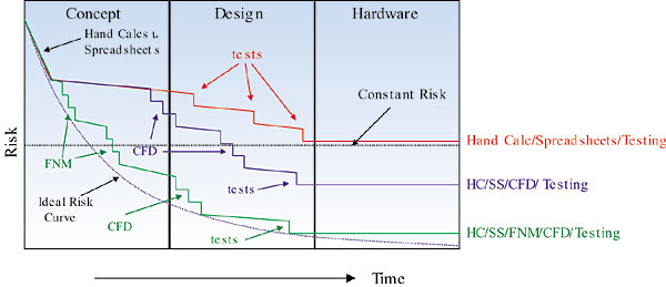 Figure 5 illustrates the importance of using the right tool at the right time. The red curve represents the risk level throughout the development cycle if only intuition, simple hand calculations and spreadsheets are used prior to testing the hardware.  The green curve shows the risk level throughout the development cycle if a complete suite of tools is used.  Note, in this case, the methodology approaches the ideal risk curve as a result of using the modeling technique that matches the design's fluidity.