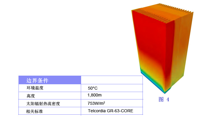利用FloTHERM進(jìn)行的CFD仿真(如圖4所示)顯示了基站系 統(tǒng)在極端操作環(huán)境
