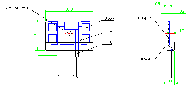 該全波整流橋采用塑料封裝結(jié)構(gòu)(大多數(shù)的小功率整流橋都是采用該封裝形式)。橋內(nèi)的四個(gè)主要發(fā)熱元器件——二極管被分成兩組分別放置在直流輸出的引腳銅板上。在直流輸出引腳銅板間有兩塊連接銅板,他們分別與輸入引腳(交流輸入導(dǎo)線)相連,形成我們?cè)谕庥^上看見的有四個(gè)對(duì)外連接引腳的全波整流橋。由于該系列整流橋都是采用塑料封裝結(jié)構(gòu),在上述的二極管、引腳銅板、連接銅板以及連接導(dǎo)線的周圍充滿了作為絕緣、導(dǎo)熱的骨架填充物質(zhì)——環(huán)氧樹脂。然而,環(huán)氧樹脂的導(dǎo)熱系數(shù)是比較低的(一般為0.35℃W/m,最高為2.5℃W/m),因此整流橋的結(jié)--殼熱阻一般都比較大(通常為1.0~10℃/W)。通常情況下,在元器件的相關(guān)參數(shù)表里,生產(chǎn)廠家都會(huì)提供該器件在自然冷卻情況下的結(jié)—環(huán)境的熱阻(Rja)和當(dāng)元器件自帶一散熱器,通過散熱器進(jìn)行器件冷卻的結(jié)--殼熱阻(Rjc)。