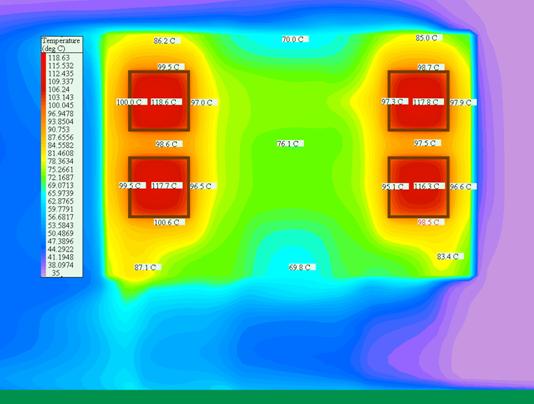 圖8是整流橋內(nèi)部熱源中間截面的溫度分布。由該圖也可以進(jìn)一步說明,在整流橋內(nèi)部由于器封裝材料是導(dǎo)熱性能較差的FR4,所以其內(nèi)部的溫度分布極不均勻。我們以后在測(cè)量或分析整流橋或相關(guān)的其它功率元器件溫度分布時(shí),應(yīng)著重注意該現(xiàn)象,力圖避免該影響對(duì)測(cè)量或測(cè)試結(jié)果產(chǎn)生的影響。