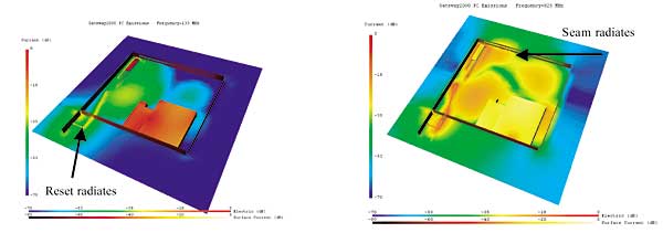 在圖4中,模擬時(shí)寬帶頻譜被時(shí)鐘頻譜加倍。將試驗(yàn)結(jié)果與在無(wú)回波響應(yīng)腔中取得的測(cè)試數(shù)據(jù)進(jìn)行對(duì)比。盡管復(fù)位線(xiàn)沒(méi)有采取屏蔽措施,輻射仍在FCC的B類(lèi)限制范圍之內(nèi)(由216兆赫至960兆赫的允許最多衰減量為46dBuV/m)。由于在模型中沿縫處沒(méi)有電接觸,因此模擬時(shí)輻射可能擴(kuò)大到700兆赫以上。