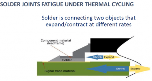 焊點的橫截面,以及不同的熱膨脹系數(shù)導致材料收縮或膨脹