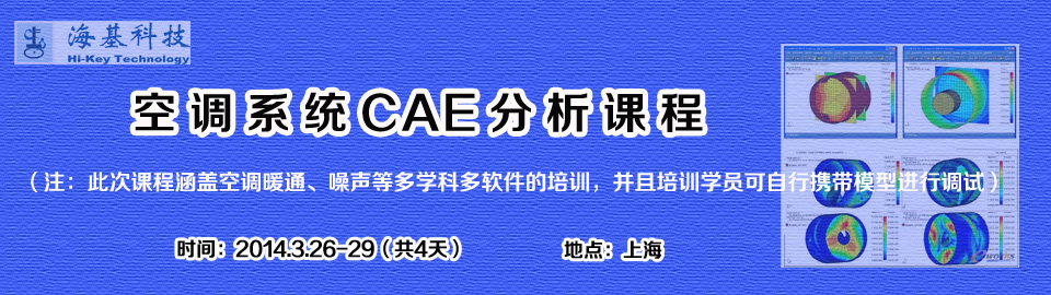 為了解決空調(diào)系統(tǒng)CAE分析難題,海基科技將于2014年3月26-28日(共三天)在上海舉辦空調(diào)系統(tǒng)CAE分析課程,培訓內(nèi)容包括空調(diào)系統(tǒng)基本理論知識;暖通和建筑環(huán)境分析方法;空調(diào)系統(tǒng)噪聲分析等。除此之外,參加此次培訓的客戶可提前提供涉及到培訓軟件的模型,2014年3月29日海基科技工程師將一對一指導,幫您完成模型調(diào)試。歡迎大家踴躍參與!