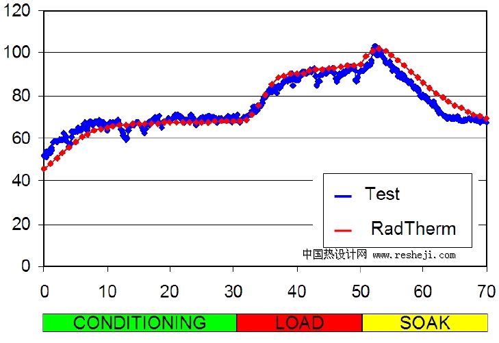 Radtherm分析了排氣管出口處溫度在整個70分鐘的瞬態(tài)過程中的變化情況,實測了這種工況下該處的溫度結果,二者吻合得很好。測試和仿真結果顯示,排氣管出口在停車初期的溫度甚至超過了大負荷爬坡過程的溫度。這也表明發(fā)動機排氣系統(tǒng)的熱分析中,一定要考慮惡劣工況下的瞬態(tài)過程,否則不能發(fā)現(xiàn)潛在的熱故障。
