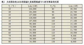 表2是Edison公司給出的大功率白光LED的結(jié)溫TJ在亮度衰減70%時與壽命的關(guān)系(不同LED生產(chǎn)廠家的壽命并不相同,僅做參考)。