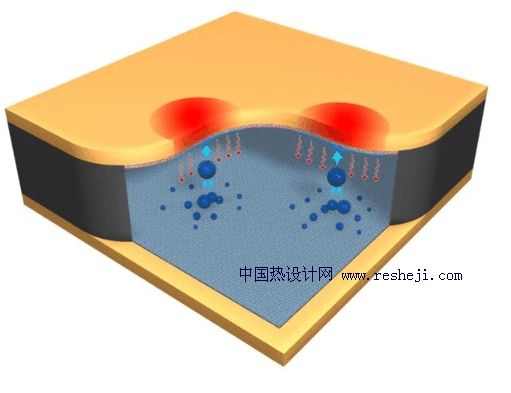 研究人員仍然是使用蒸汽腔來測試這種產(chǎn)品的散熱效果。這個“蒸汽腔”的下側(cè)是超疏水的“地板”,上側(cè)是超親水的“天花板”。蒸汽腔安裝到電子元器件上之后,親水側(cè)通過導(dǎo)熱界面材料直觸電子元件,工作時,親水側(cè)被加熱,液體蒸發(fā),蒸汽在冷端疏水側(cè)凝結(jié)成微小的水滴。這些微細(xì)水珠落在超疏水的地板上,連接在一起成為更大的水滴,這一更大的液滴表面能更低,多出的表面能就會在液滴合成時釋放,從而驅(qū)動水滴從疏水側(cè)彈起,回到親水側(cè)。如此循環(huán)往復(fù),形成厚度方向上的氣液循環(huán)。