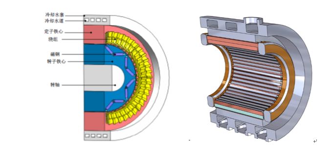 目前常規(guī)電動汽車的電機一般采用水套冷卻。驅(qū)動電機剖面如下圖所示,定子鐵心與冷卻水套之間采用過盈配合進行裝配,這樣電機定子鐵心中產(chǎn)生的電磁力將通過此種配合傳遞到冷卻水套上。整個電機內(nèi)產(chǎn)生的熱量也將被冷卻水帶走。