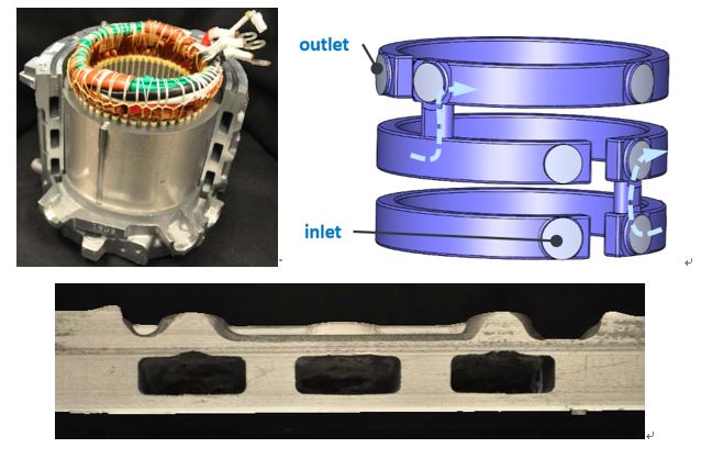 以下組圖為尼桑LEAF電動汽車的驅(qū)動電機的冷卻水套系統(tǒng)。該水套采用鑄造成型,在高度方向上分三層,每層留設(shè)中空的流道,各層之間有流道相連。整個水套與電機定子外壁過盈配合,最大限度減小兩者之間的熱阻。