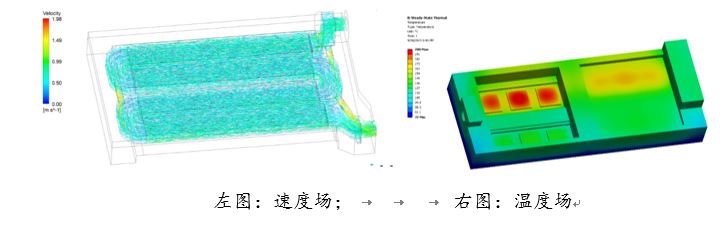 下圖給出的為我司為某公司高功率密度IGBT組件水冷系統(tǒng)設(shè)計和熱流分析所做的工作。流體流速分布非常均勻,可滿足大功率IGBT器件的散熱要求。