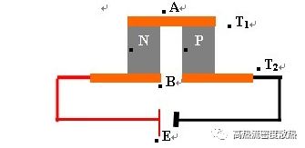如圖所示的是一個最簡單、最基本的溫差電器件,由N、P兩種類型的半導體溫差電材料經電導率較高的導流片串聯(lián)構成。當電流流過回路時,將在接頭A處發(fā)生吸熱,而在接頭B處放熱,使得T2>T1,因而在A、B兩端建立溫差ΔT=T2-T1。
