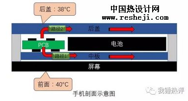 如下圖所示,手機主要發(fā)熱源是主板PCB(上面的器件),其熱量傳導在內部有兩條路徑。