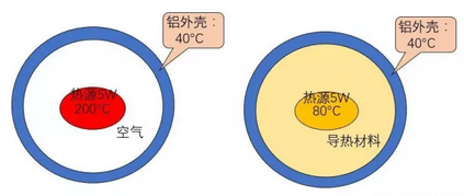 這個產品,無論內部的結構如何變化,比如無論熱源和鋁殼之間是空氣還是導熱材料,鋁殼的表面平均溫度都是40°C,所不同的,是熱源本身的溫度。這說的就是:功耗定了,則其表面加權平均溫度也就定了。