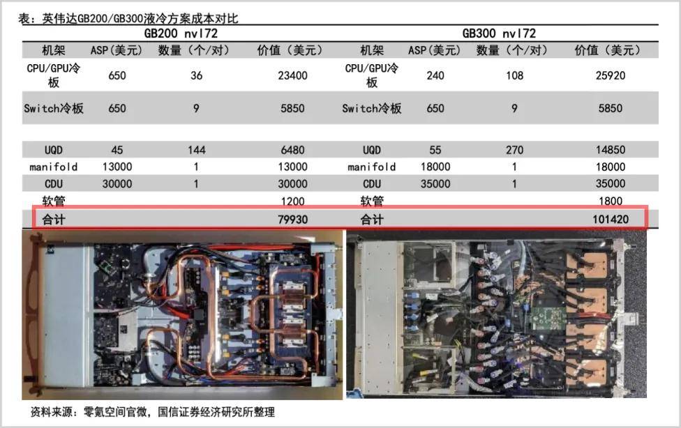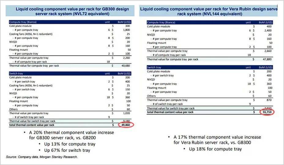而下一代Vera Rubin NVL144平臺的散熱成本將更高,預(yù)計每個機柜的冷卻組件總價值將增長17%,達到55710美元(約40萬元),冷卻模塊的價值將顯著增長67%。而據(jù)國信證券研究,GB300的液冷方案總成本高達101420美元,約等于72萬元,比上一代足足高出近30%。