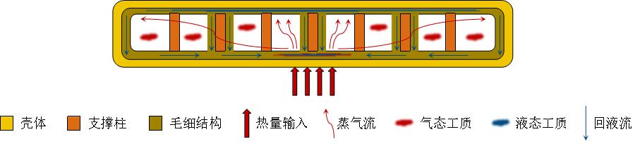早期應(yīng)用的VC是最經(jīng)典的純金屬支撐柱式,支撐柱僅發(fā)揮結(jié)構(gòu)加強(qiáng)的作用。之后演變出在支撐柱外套一層粉末燒結(jié)毛細(xì)環(huán),或直接將金屬柱換成毛細(xì)粉柱,采用純毛細(xì)柱排列或金屬柱與毛細(xì)柱混合排列。這樣在冷面凝結(jié)的工質(zhì)可以通過毛細(xì)環(huán)或毛細(xì)柱向熱面蒸發(fā)區(qū)回流,回流路徑大大縮短,補(bǔ)液速率增大,VC傳熱能力因此增強(qiáng)。